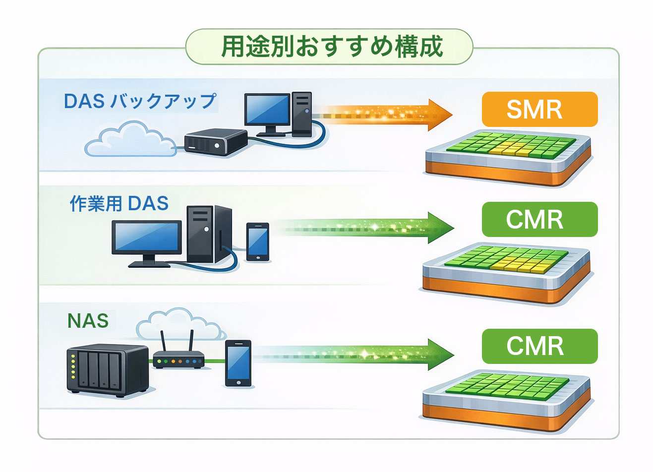 - 頻繁に書き換える用途(作業用DAS/RAID) → CMR推奨