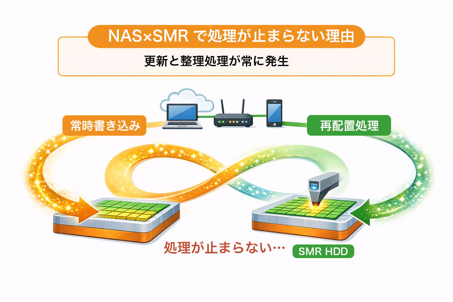 NASでは常に小さな書き込みが発生し、SMR HDDではそのたびに再配置処理が行われます。